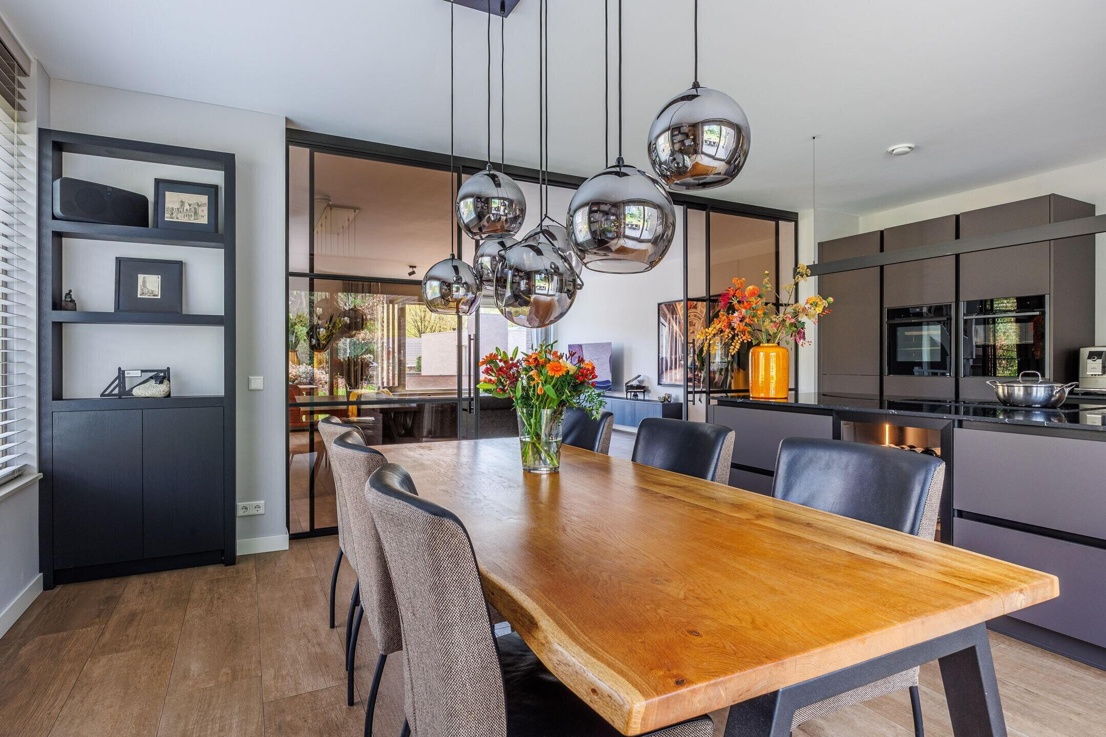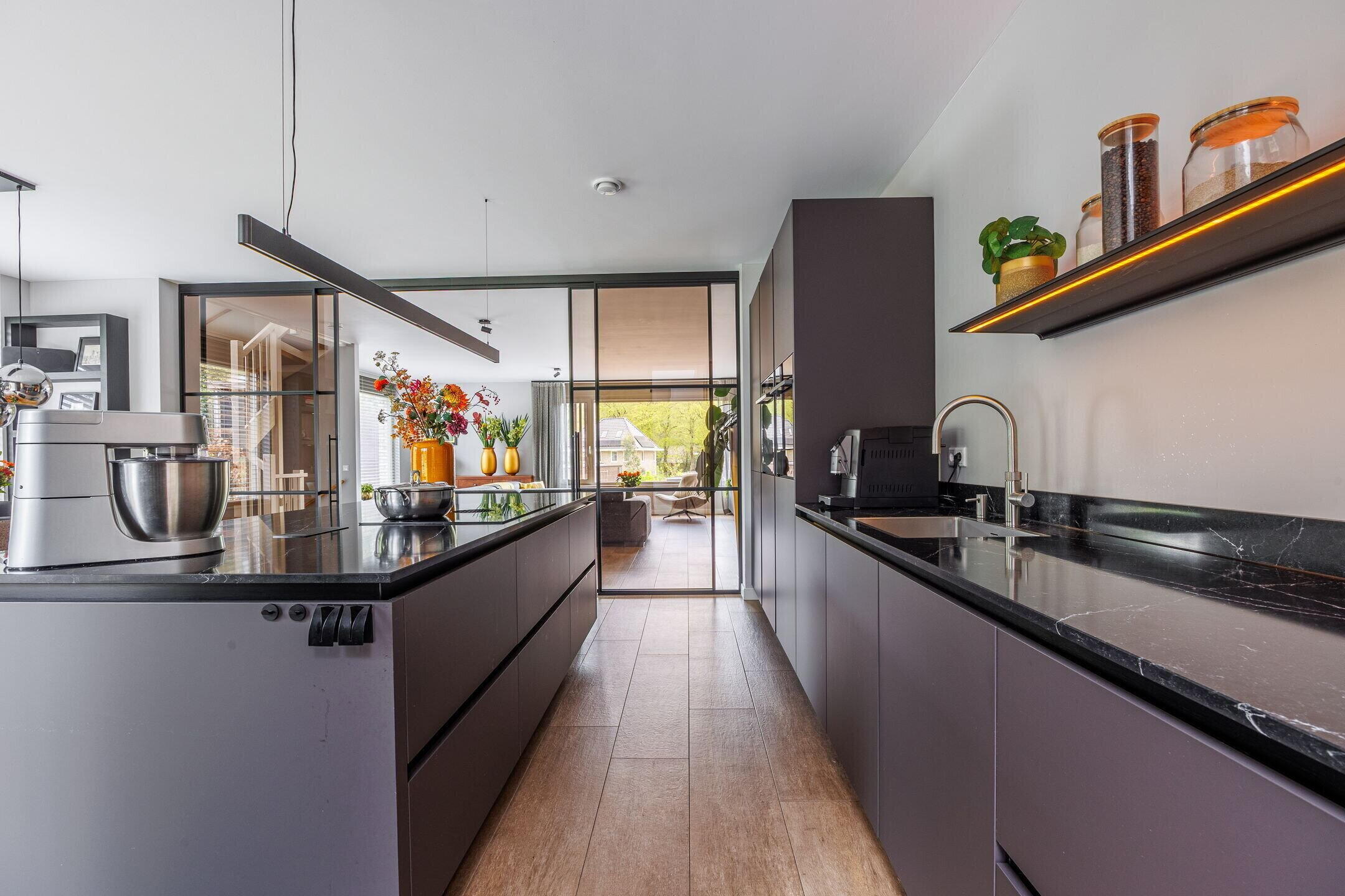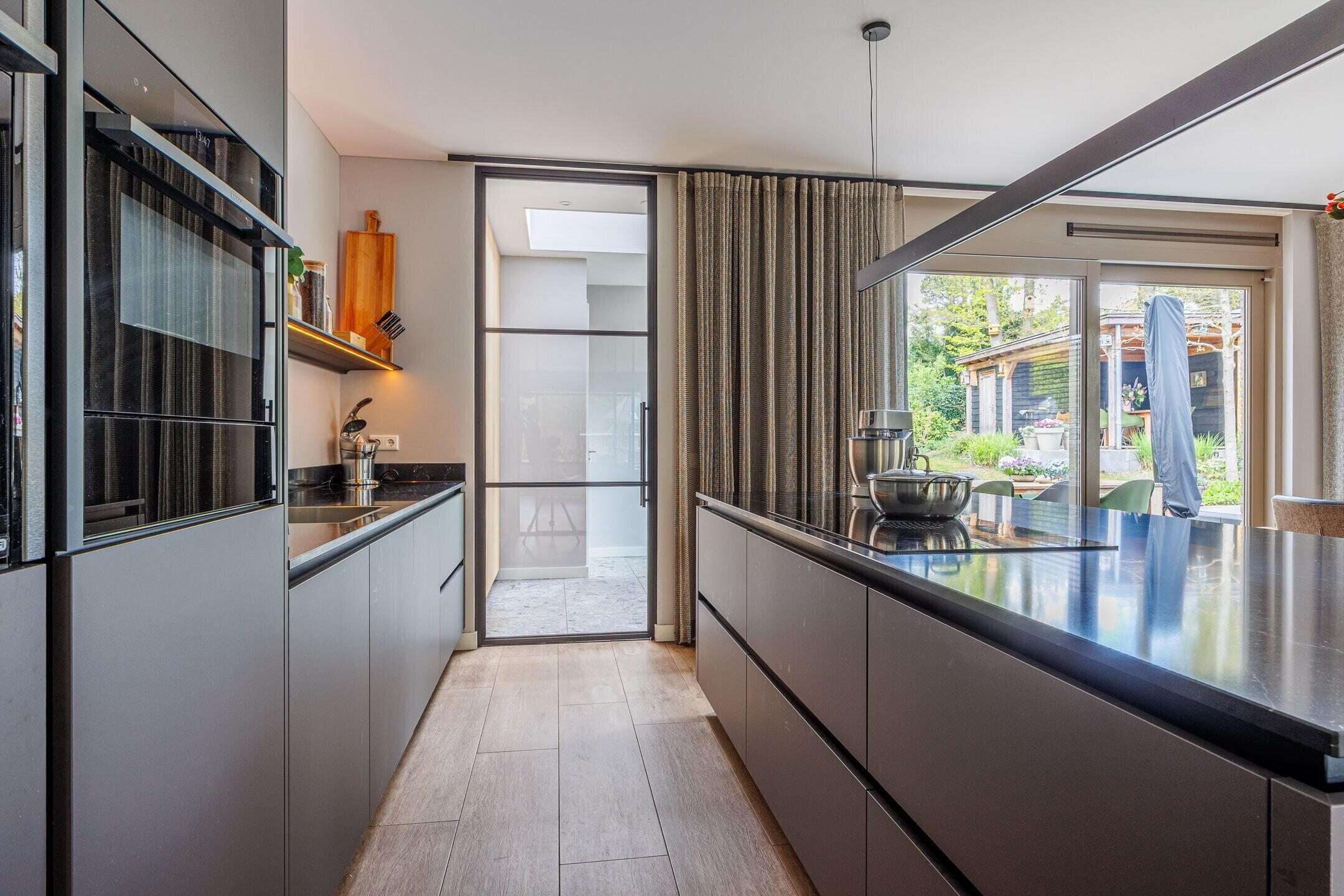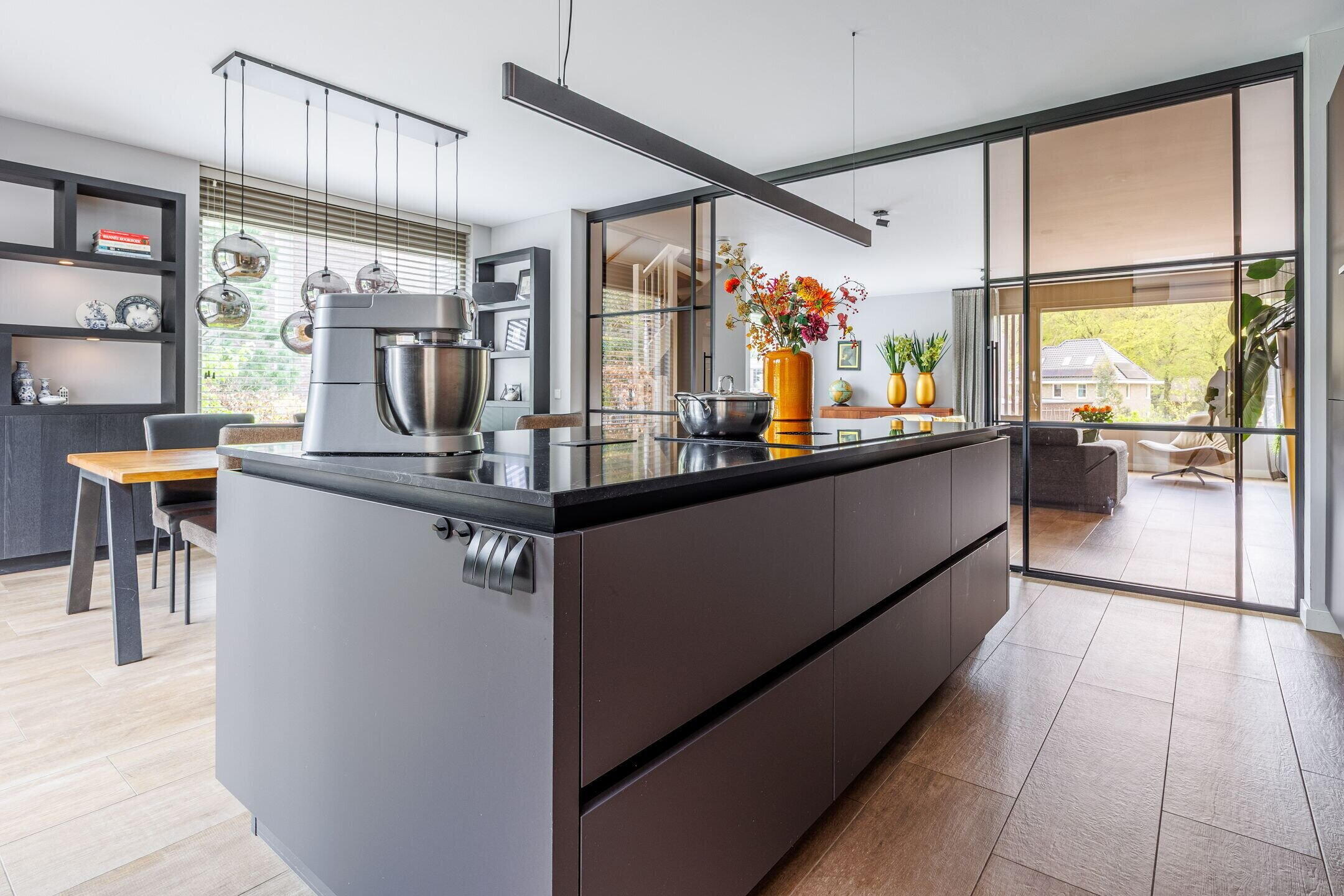 En dan de leefruimte op de 1e verdieping… wauw! De woonkamer en keuken vormen samen een indrukwekkende open leefruimte van circa 75 m². Grote raampartijen zorgen voor een prachtige lichtinval en verbinden het interieur met de groene omgeving. De luxe keuken met kookeiland is van alle gemakken voorzien, waaronder een dubbele stoomoven, wijnkast, warmhoudlade, Quooker en een koel-/vriescombinatie. Dit is een plek waar koken, tafelen en ontspannen moeiteloos samenkomen. De aangebouwde, praktische bijkeuken met toilet en bergruimte maakt het geheel compleet. Via de schuifpui vanuit de (bij)keuken loop je zo de tuin in.