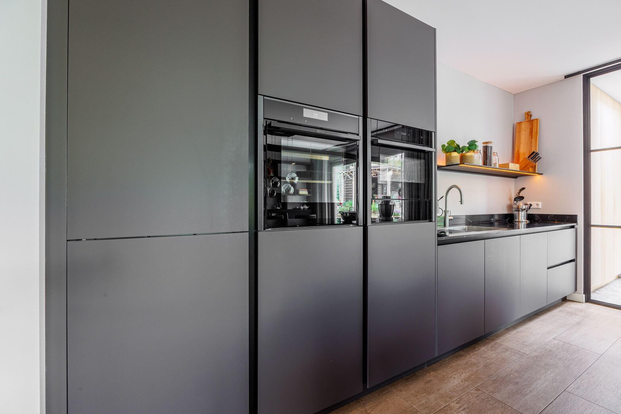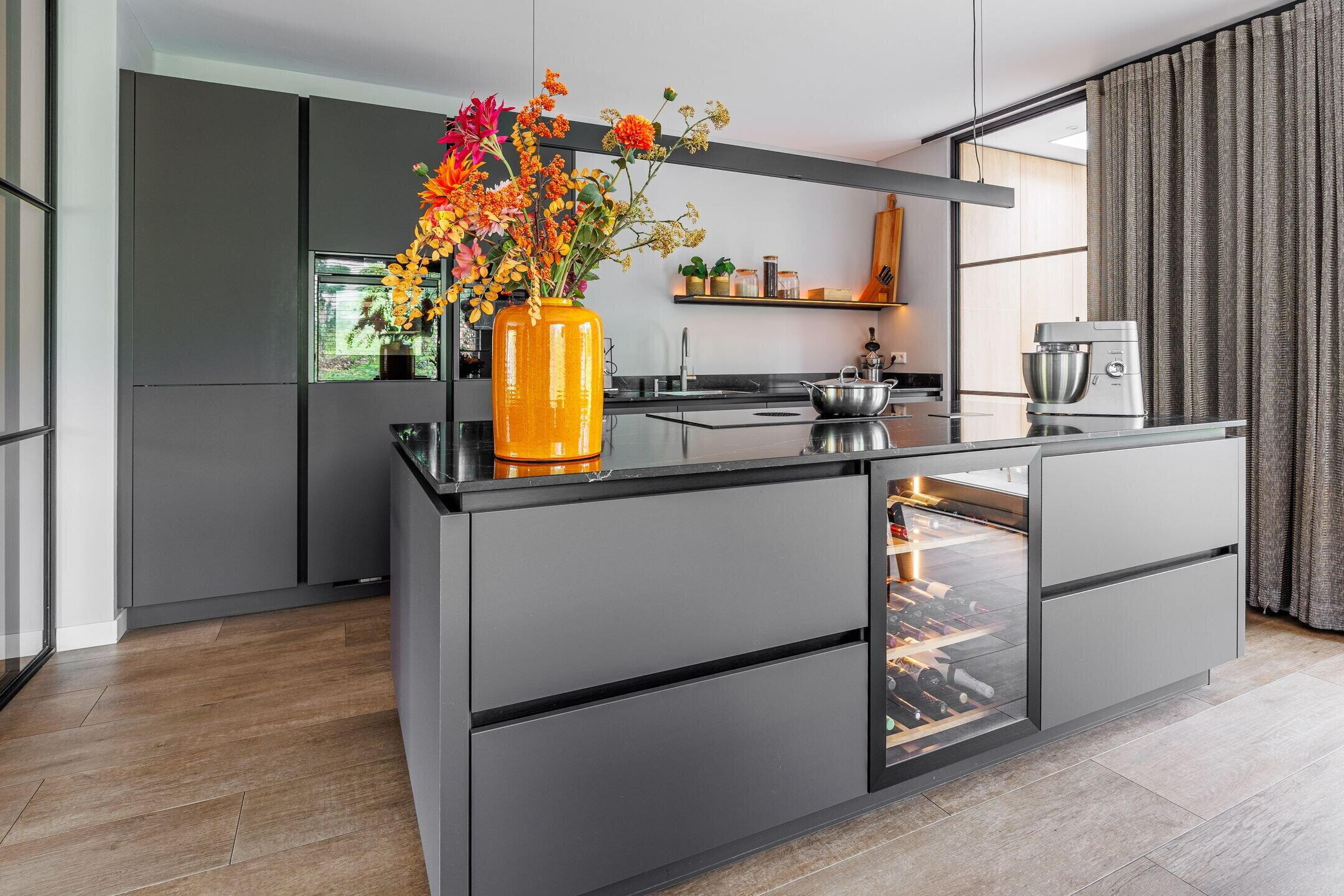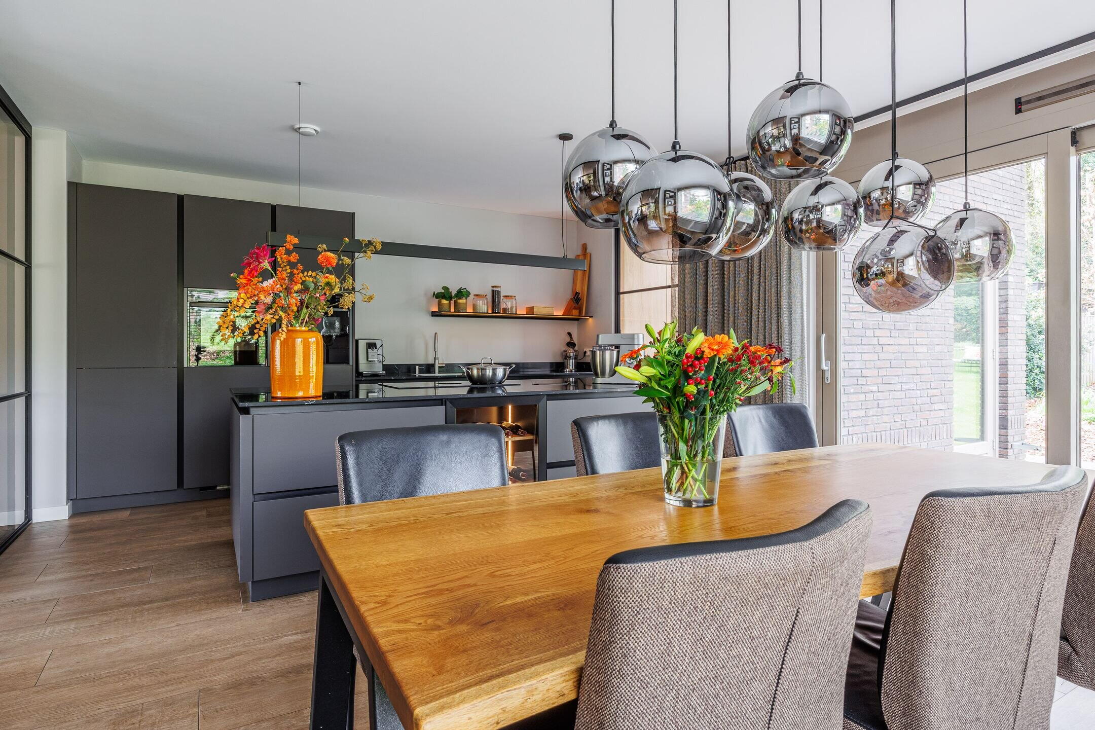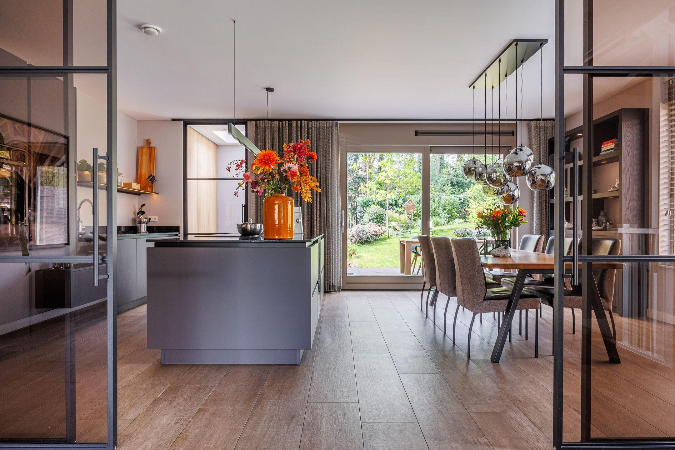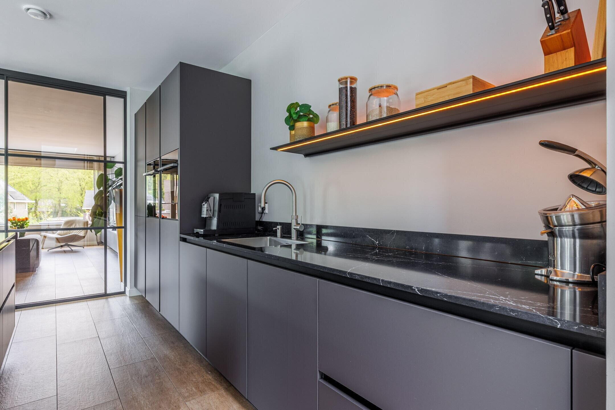 En dan de leefruimte op de 1e verdieping… wauw! De woonkamer en keuken vormen samen een indrukwekkende open leefruimte van circa 75 m². Grote raampartijen zorgen voor een prachtige lichtinval en verbinden het interieur met de groene omgeving. De luxe keuken met kookeiland is van alle gemakken voorzien, waaronder een dubbele stoomoven, wijnkast, warmhoudlade, Quooker en een koel-/vriescombinatie. Dit is een plek waar koken, tafelen en ontspannen moeiteloos samenkomen. De aangebouwde, praktische bijkeuken met toilet en bergruimte maakt het geheel compleet. Via de schuifpui vanuit de (bij)keuken loop je zo de tuin in.