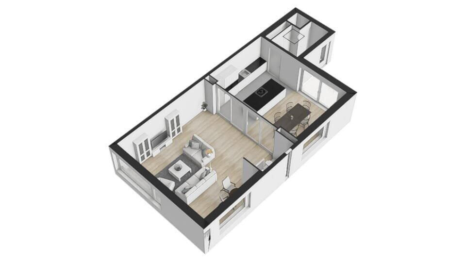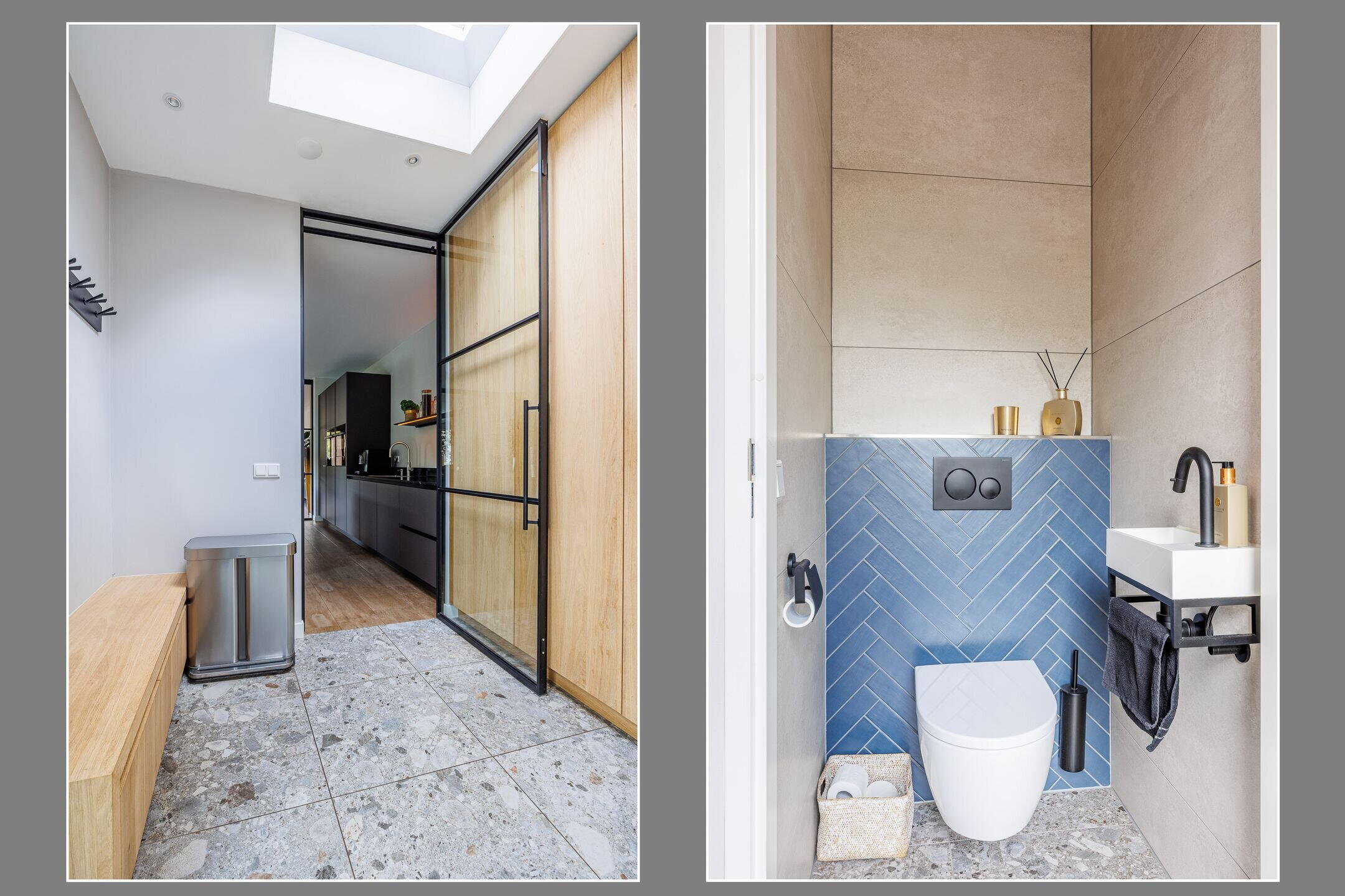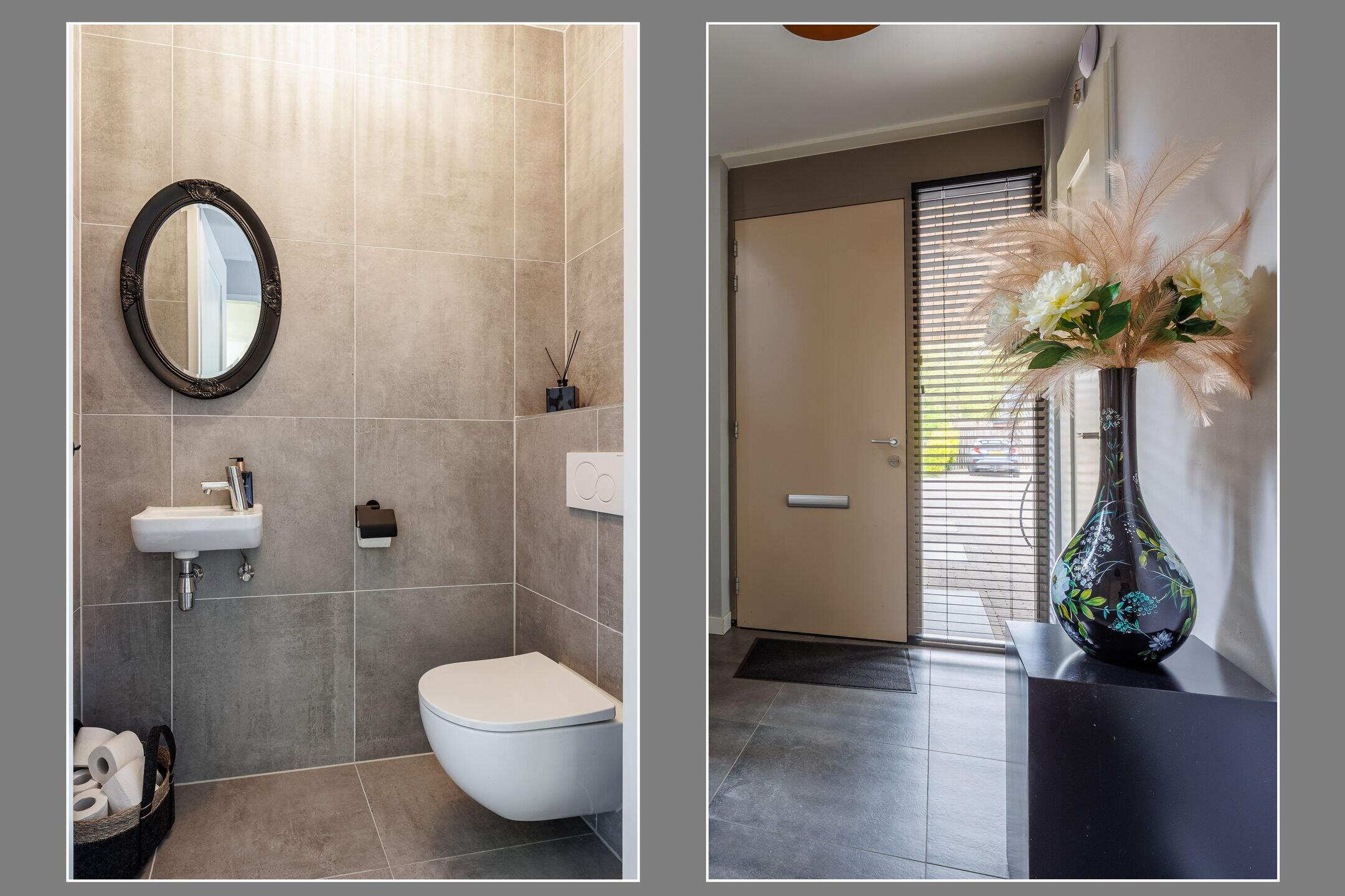 Binnen word je verrast door de royale opzet en het hoge afwerkingsniveau. De entree is ruim en verzorgd, met een garderobe, toilet en toegang tot een slaapkamer (10,5 m²) met meerdere multifunctionele (berg)ruimtes (respectievelijk 10,5 m² en 12 m²).