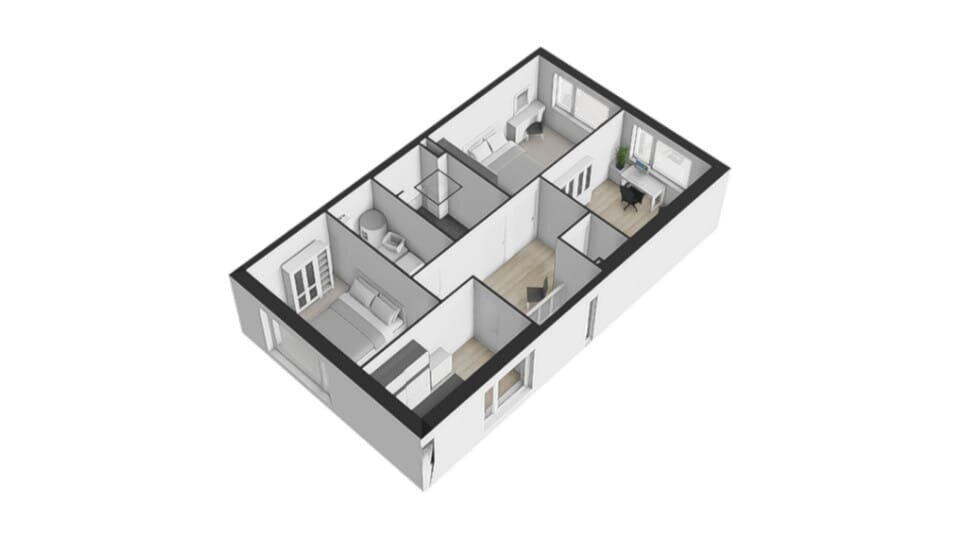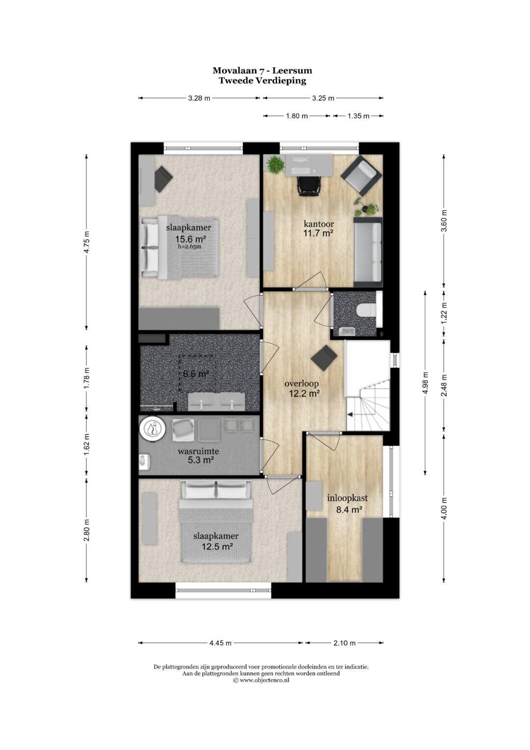Op de tweede verdieping bevinden zich vier ruime, lichte slaapkamers (15,6 m², 12,5 m² en 11.7 m² en 1 slaapkamer is nu ingericht walk-in-closet) en een moderne badkamer met separaat toilet. Ook hier valt direct de hoeveelheid licht en ruimte op. Daarnaast is er een technische ruimte met warmtepomp en aansluitingen voor witgoed. Alles is tot in detail verzorgd en volledig instapklaar.